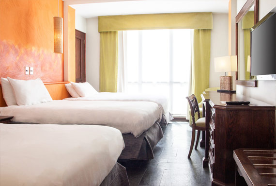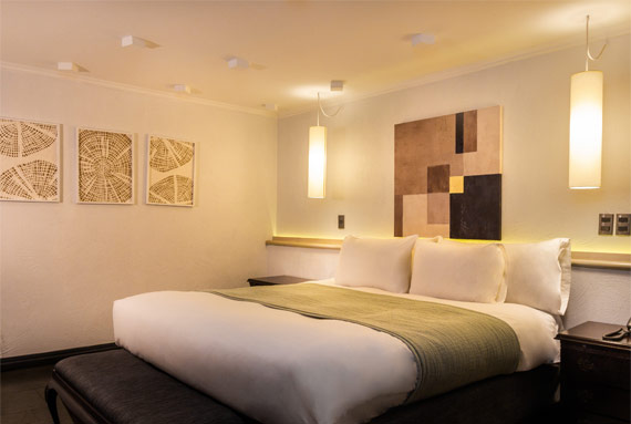Habitación con cama extra grande y TV, amplio baño privado y tina hidromasaje.